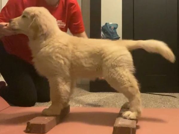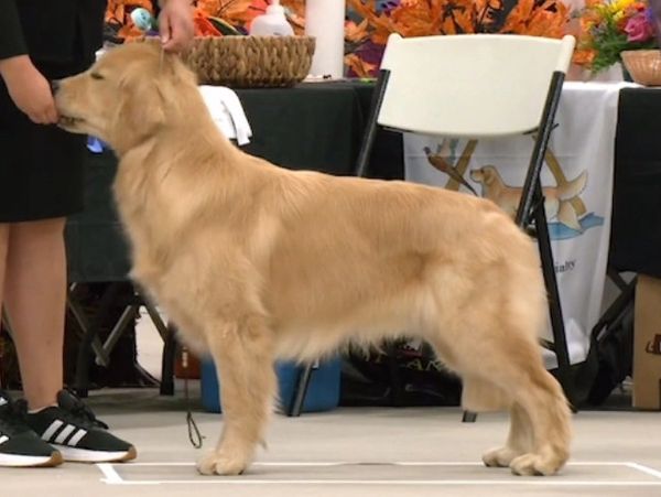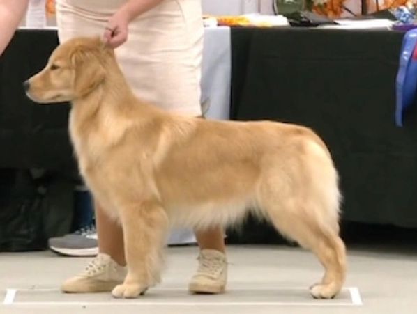 Chaser is our enthusiastic athlete who loves a good romp in the yard. She is a compact girl with a beautiful head piece. Chaser has been shown in AKC and has received multiple BPIS as well as multiple RWB from the puppy class. Chaser is owned by Sarah Rogers (Emerson Goldens) and myself.